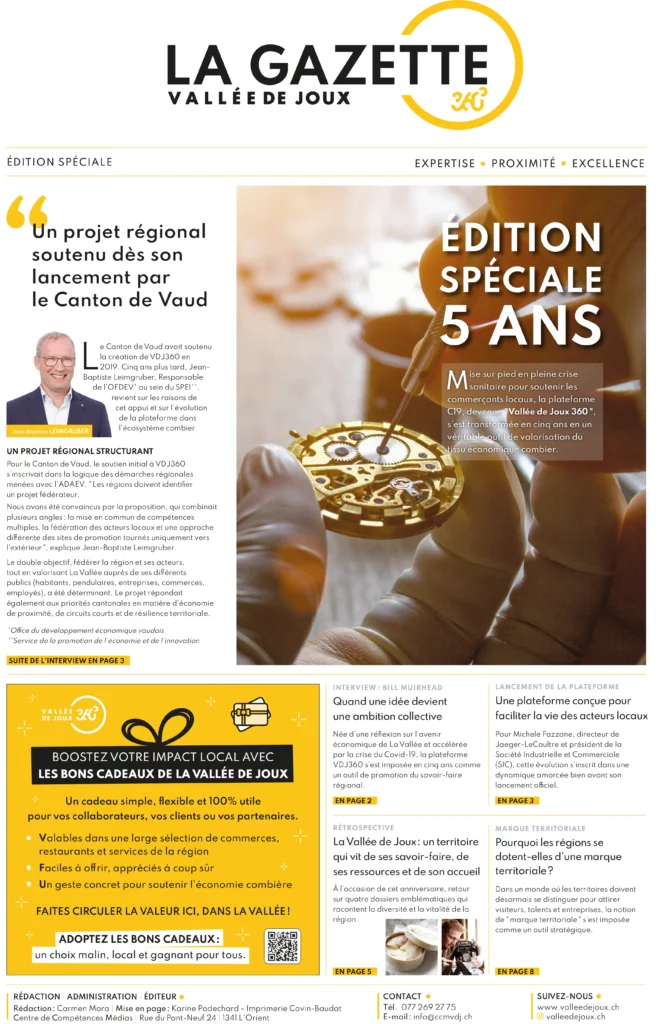 À travers ces différents supports, c’est toute l’évolution de VDJ360 qui se raconte : un projet né pour valoriser l’économie combière, devenu au fil des années une plateforme régionale reconnue, fédératrice et tournée vers l’avenir. Une étape importante qui ouvre aussi la voie à une nouvelle dynamique autour de la future marque territoriale de la Vallée de Joux.