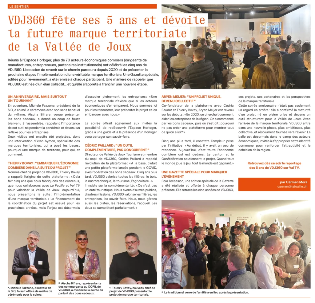L’article de La Feuille revient sur les grandes étapes de cette soirée, sur le chemin parcouru depuis 2020 et sur la prochaine ambition portée par le territoire : la construction d’une véritable marque territoriale pour la Vallée de Joux.